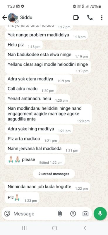 The duo exchanged numbers and used to chat on whatsapp before Siddegowda came to Bengaluru in October last year and stayed in a lodge at Basaveshwara Nagar.