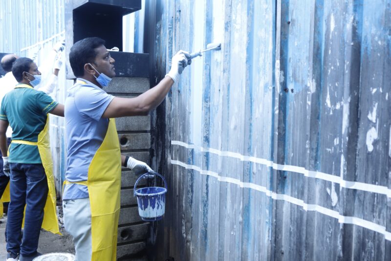 Wearing an apron,gloves,and a face mask,the Commissioner actively took part in the cleanup – sweeping the streets,removing posters from walls, painting decorative sheets with a brush, and later joining others in sitting on the cleaned footpath to share refreshments.
