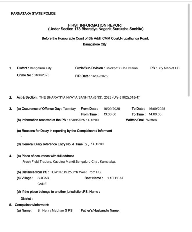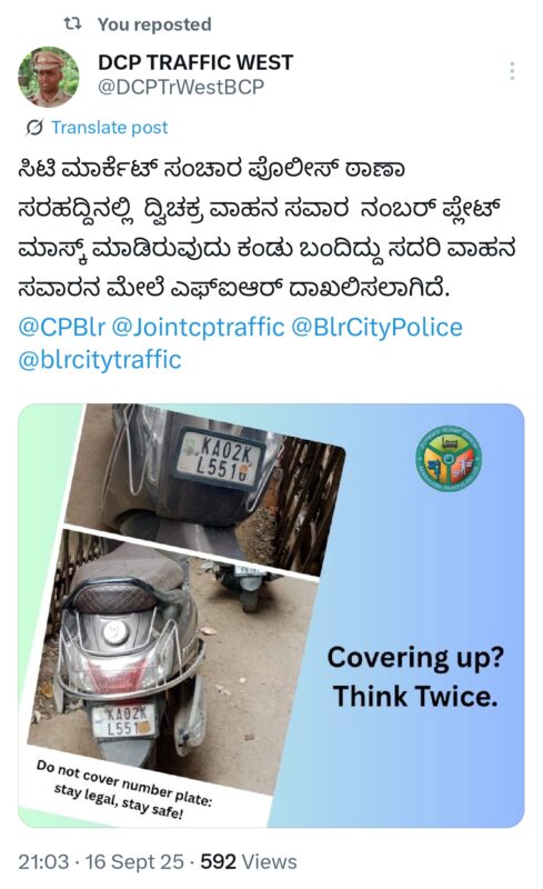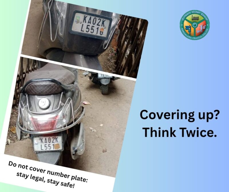 The incident came to light when City Market traffic police Sub Inspector Madan Henry who was on rounds noticed registeration number plates of Suzuki Access covered with stickers on both sides parked in the KR market police station limits near Sugarcane market.