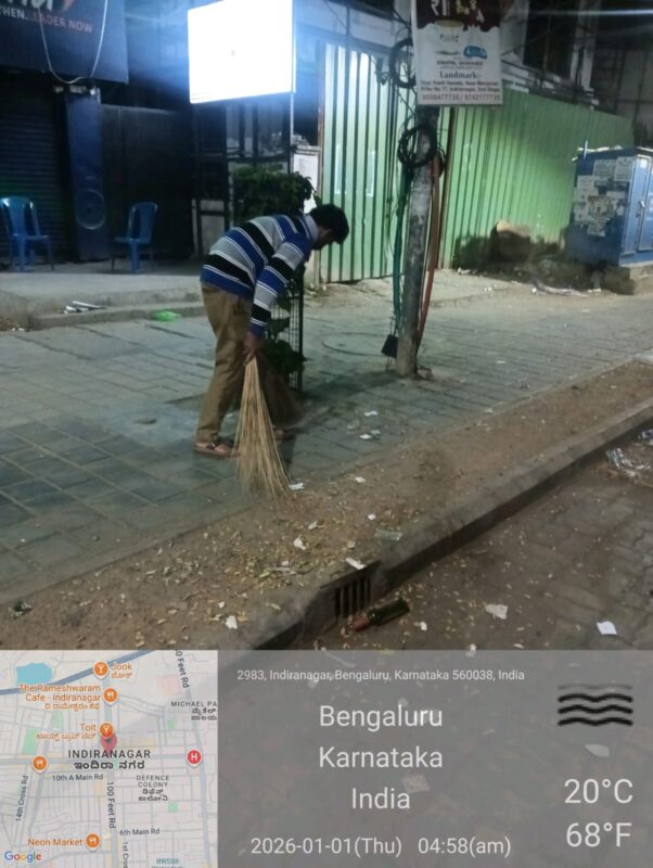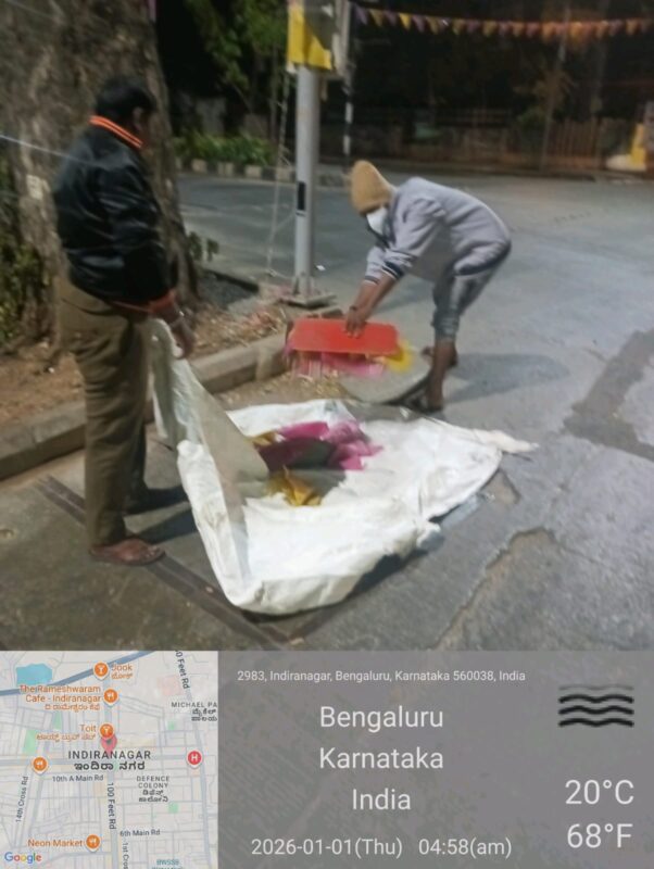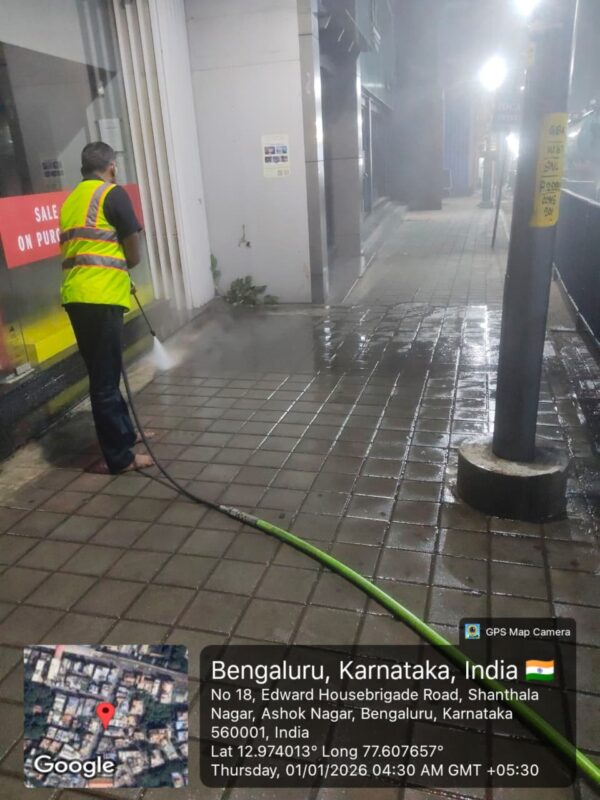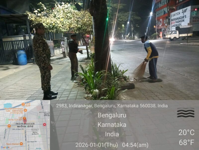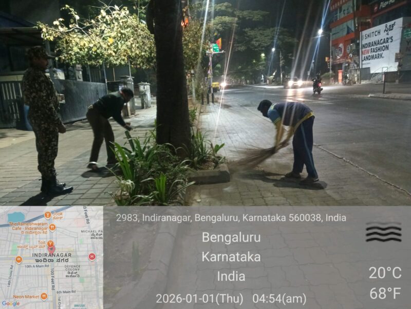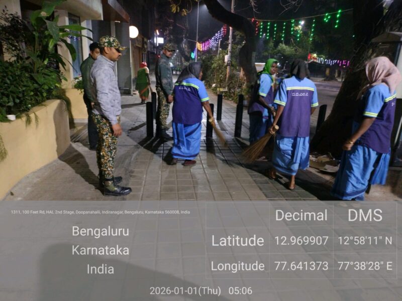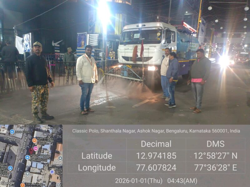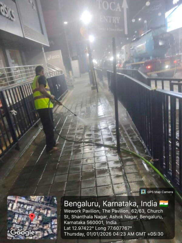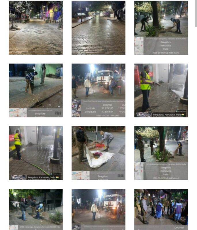 Within the limits of the Bengaluru Central City Corporation,sanitation operations were carried out today between 3.00 AM and 8.00 AM,during which cleaning activities were undertaken across M.G.Road,Brigade Road, Church Street,St.Mark’s Road,Indiranagar,and Residency Road.