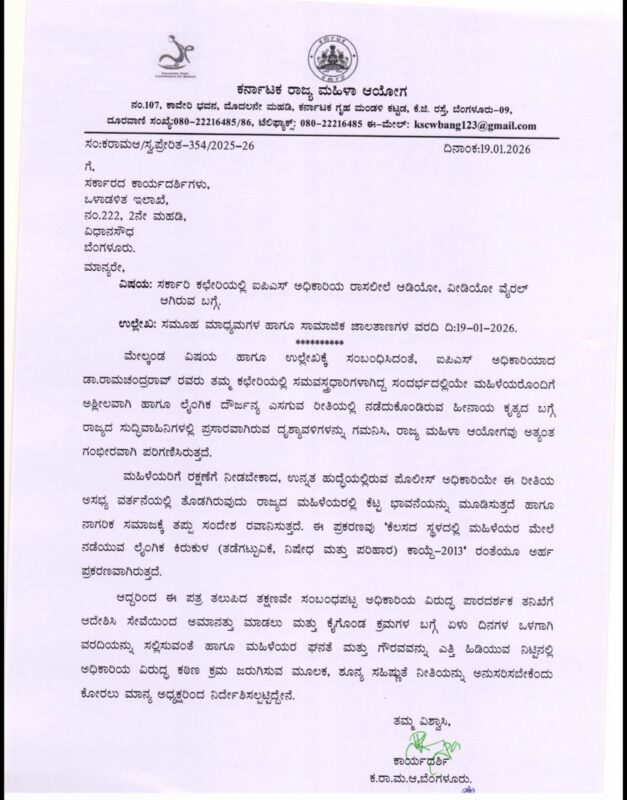 In her letter dated January 19, 2026,Dr.Nagalakshmi Bai referred to a complaint received by the Commission and said that the alleged incident,in which Ramachandra Rao, DGP,senior police officer in uniform is accused of indulging in such an act,is a matter of serious concern.