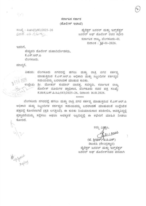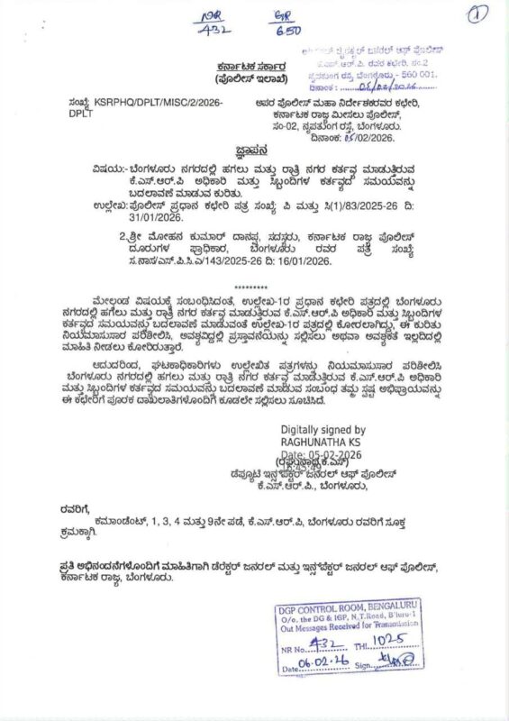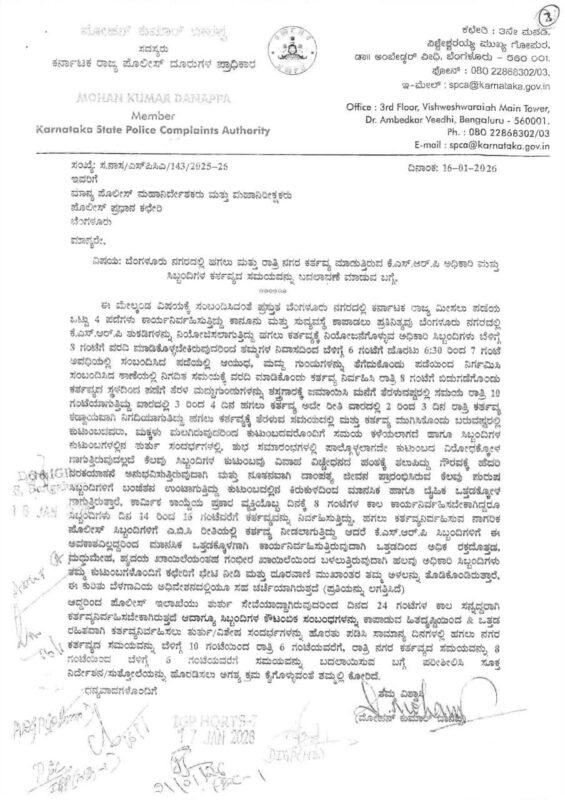 The Karnataka State Police Complaints Authority (KSPCA) has urged the Director General and Inspector General of Police (DG&IGP) to consider revising the duty timings of Karnataka State Reserve Police (KSRP) personnel deployed for day and night duties in Bengaluru,citing severe physical, mental, and family-related stress among officers and staff.