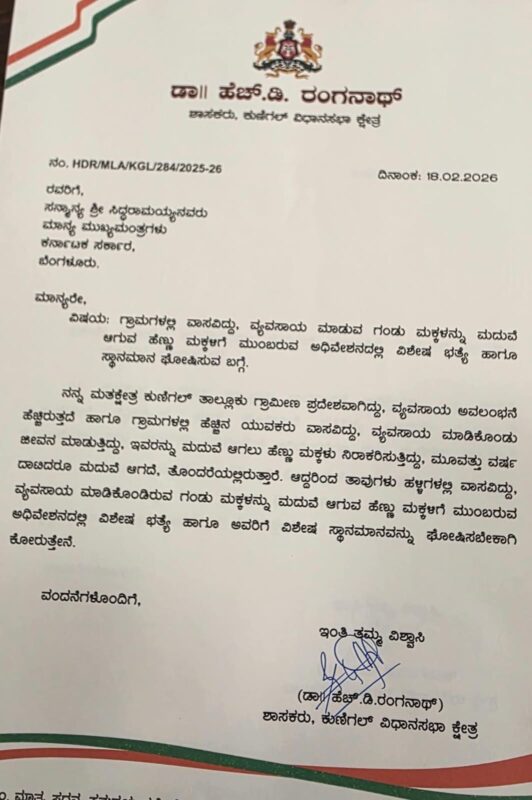 In a letter dated February 18, 2026,the MLA stated that Kunigal Assembly constituency is predominantly rural, with agriculture being the primary occupation.A large number of young men in villages depend on farming for their livelihood.