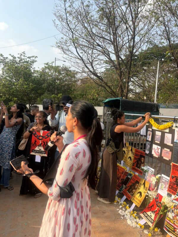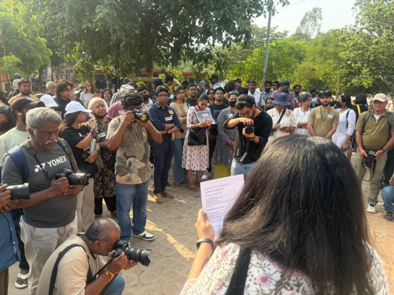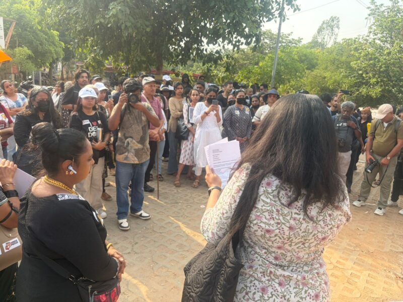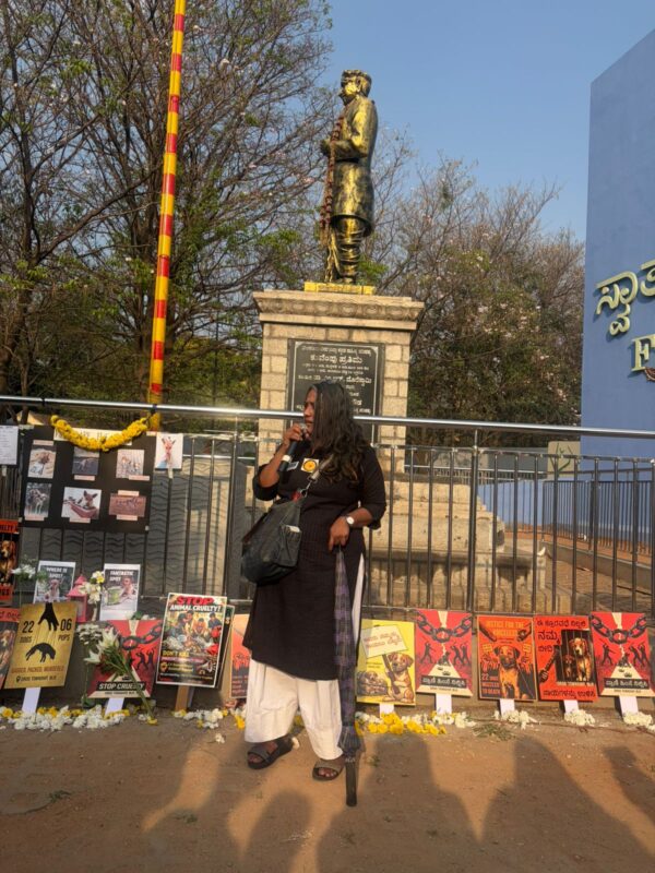 A group of city based animal lovers gathered at FreedomPark to protest against the illegal and inhumane capture of community dogs from the DRDO Phase 2 campus in Kaggadasapura.