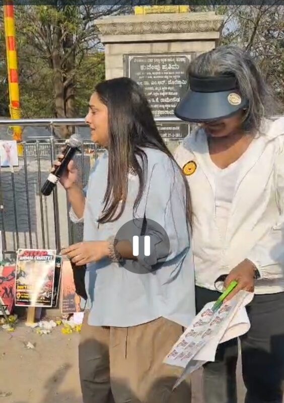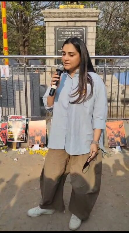 Actor and politician Ramya (DivyaSpandana) broke down while addressing the gathering, visibly shaken by the cruelty inflicted on the dogs.