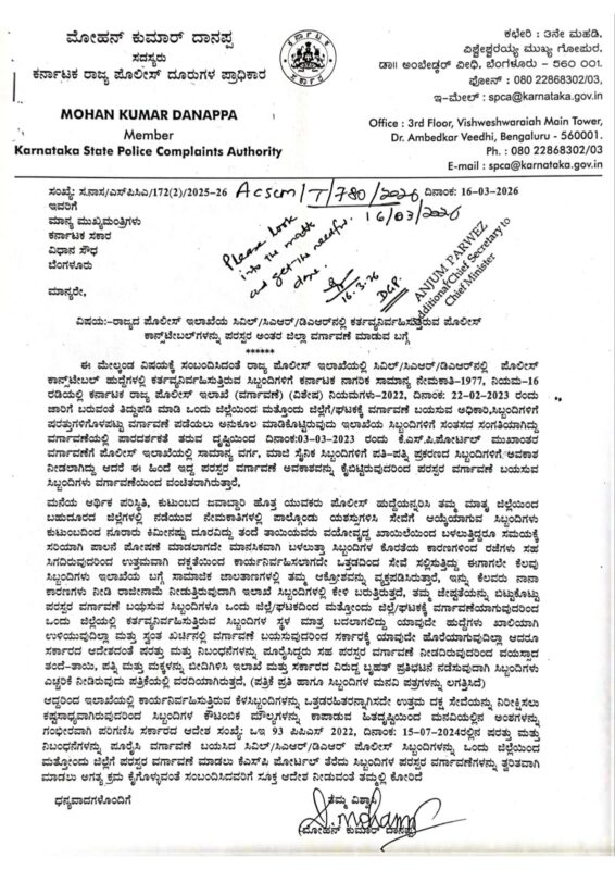 Mohan Kumar Danappa,Member of the Karnataka State Police Complaints Authority,has written to the Additional Chief Secretary highlighting the issue and urging immediate intervention.