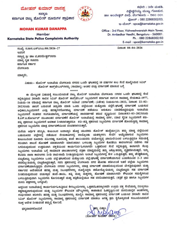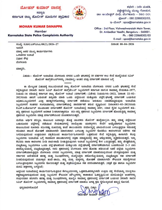 In his communication,Danappa pointed out that under earlier norms,constables were eligible for transfer to their home districts after three years of service.