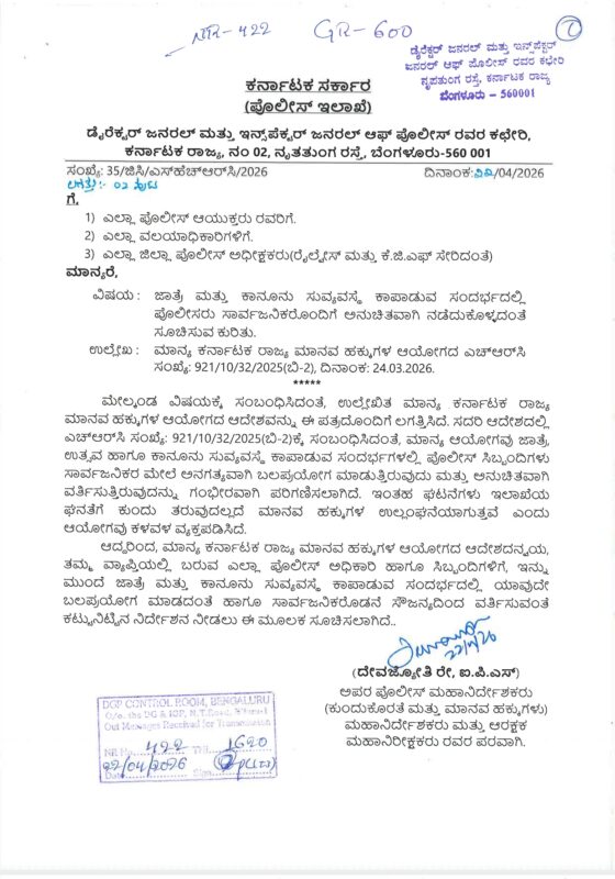 The Karnataka Police Headquarters has issued a directive to all field units across the state, instructing personnel to refrain from using force and to behave courteously with the public during fairs,festivals,and law-and-order duties.