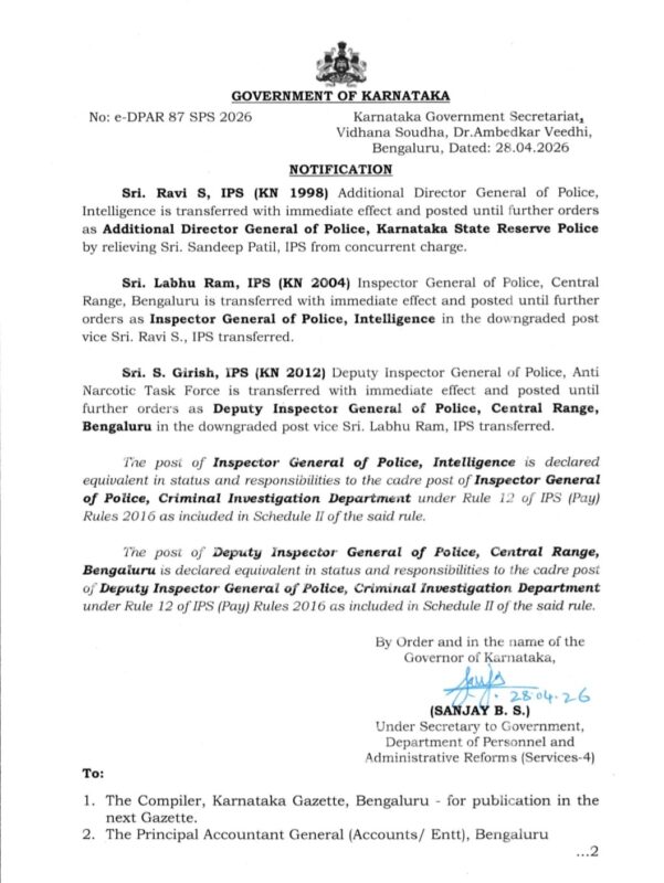 According to the order,Ravi S,(1998 batch),who was serving as Additional Director General of Police (Intelligence),has been transferred and posted as Additional Director General of Police,Karnataka State Reserve Police (KSRP).He replaces Sandeep Patil,IPS, who has been relieved from holding concurrent charge of the post.
